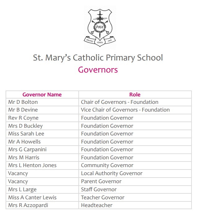 There are many roles within St. Mary's that are there to support our pupils and the day to day logistics of school life, you will see these members of staff and their role(s) listed below. The school is also supported by a Full Governing Body, led by the Chair of the Governors, Mr David Bolton.